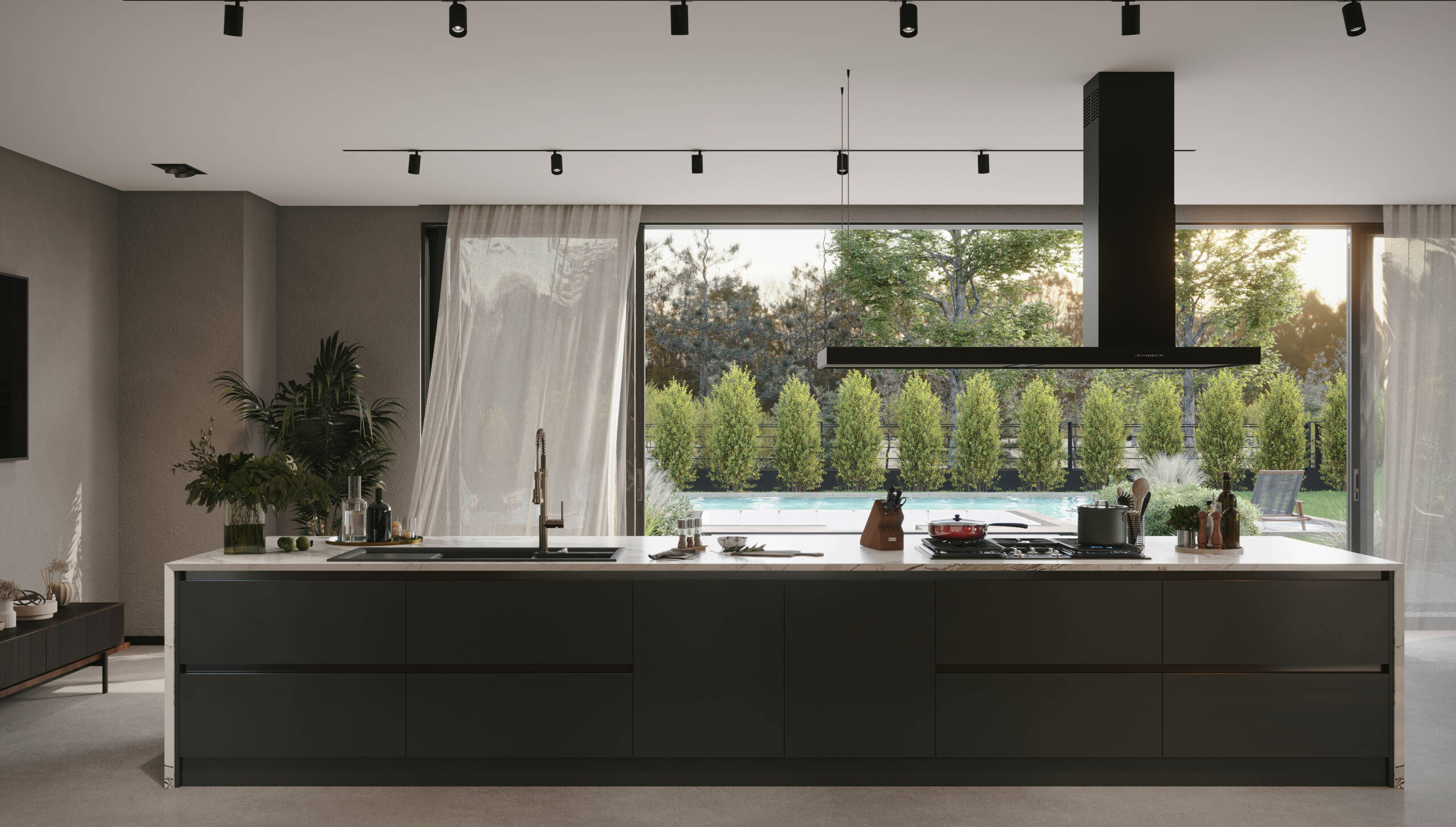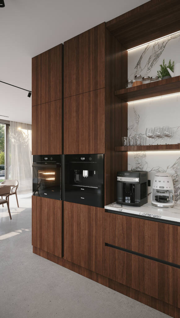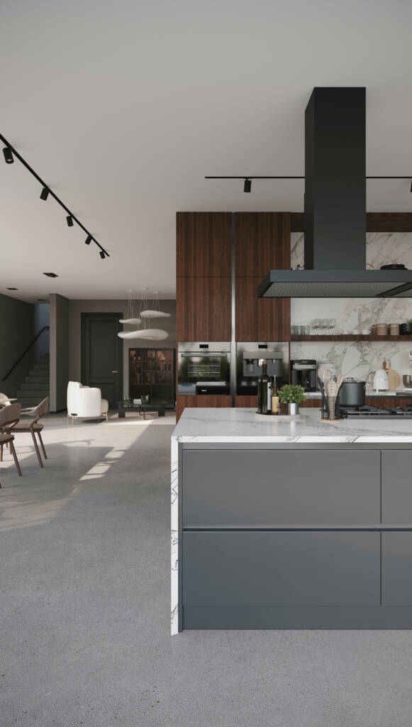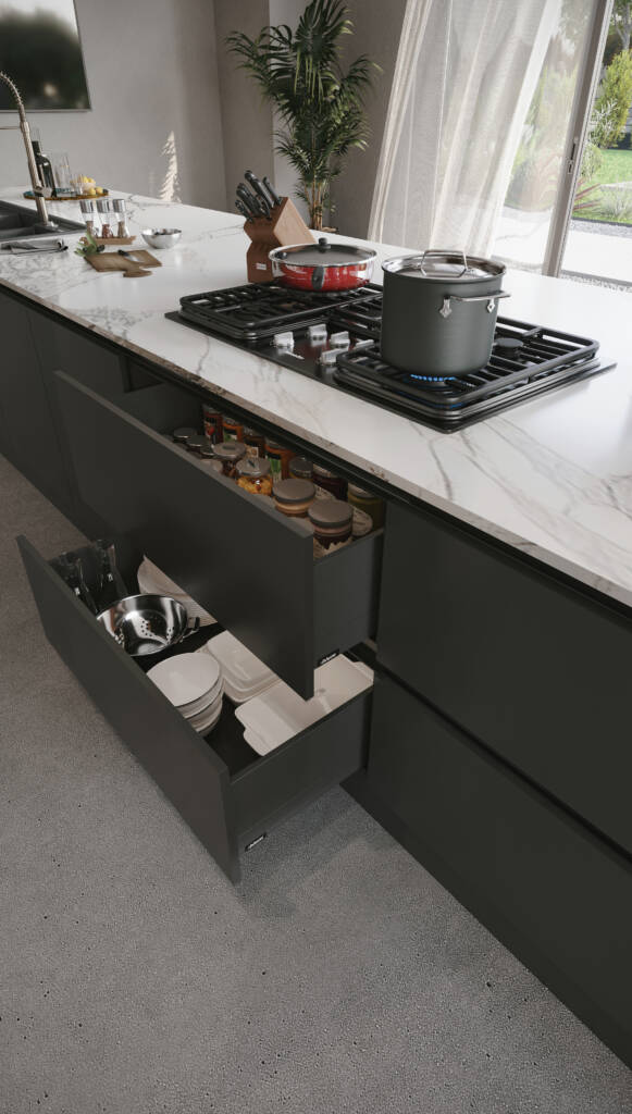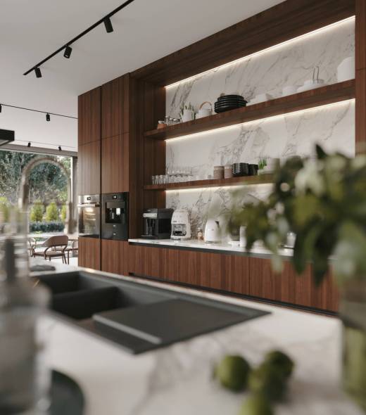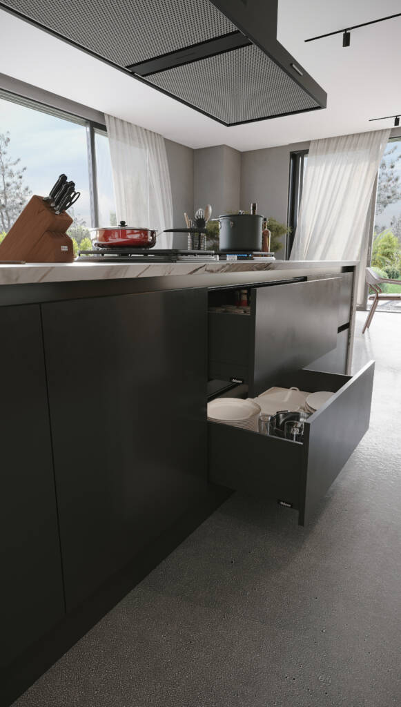 Chroma, boyutlar üzerinde yaptığı sofistike oyunla etkileyicidir. Tezgah ve dolaplar ustaca dengelenerek dinamik ve büyüleyici bir kompozisyon oluşturur. Çekmeceli raflar, alanı yaratıcı bir şekilde kullanarak bu konsepti daha da güçlendirir. Silvo’nun kendine özgü tasarım dilinde, tezgah dolapların üzerinde süzülür ve sanki havada asılıymış gibi bir izlenim yaratır. Bu, mutfak eşyaları ve kişisel aksesuarlar için mükemmel bir sahne görevi gören açık bir alan yaratır.