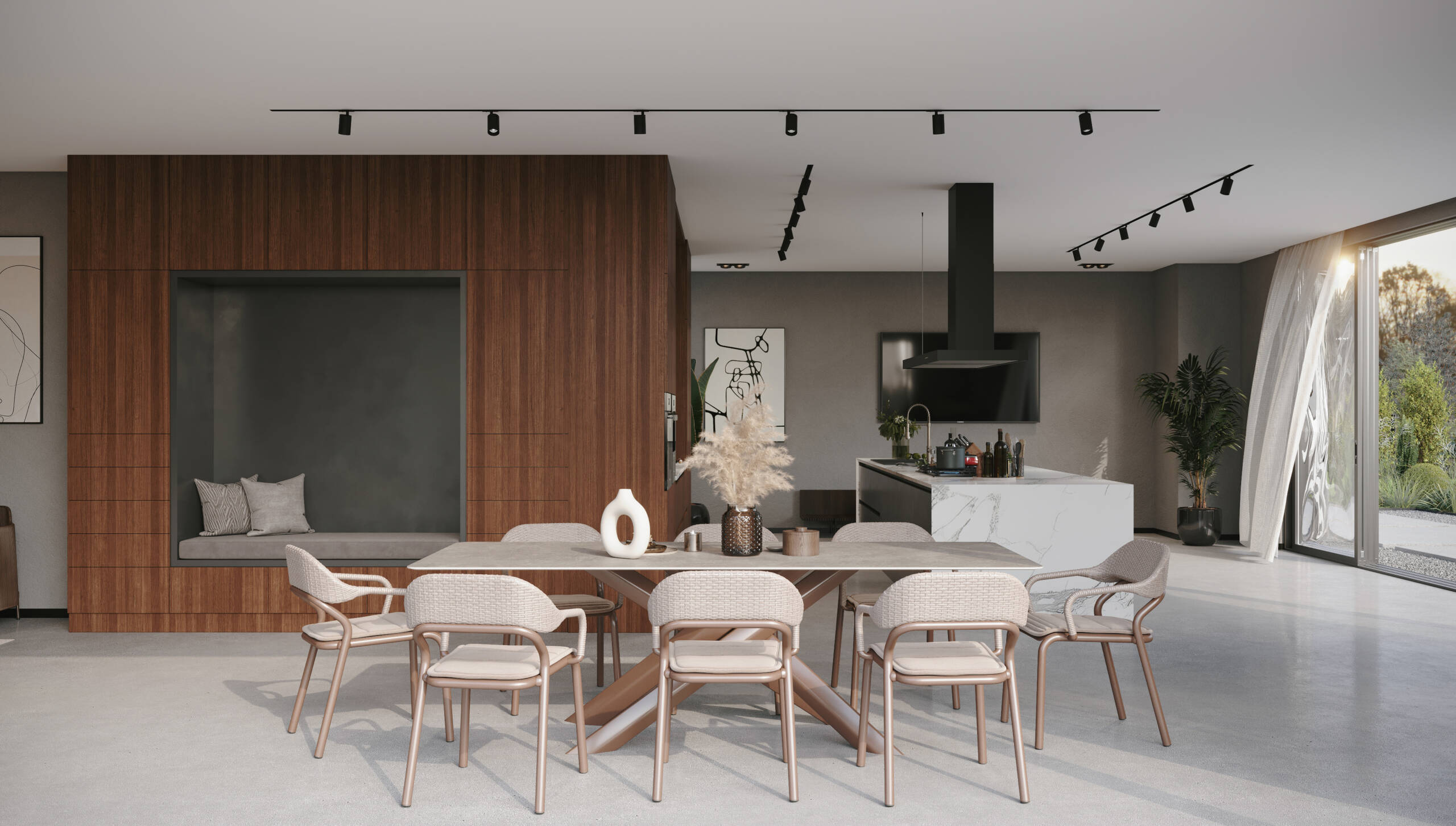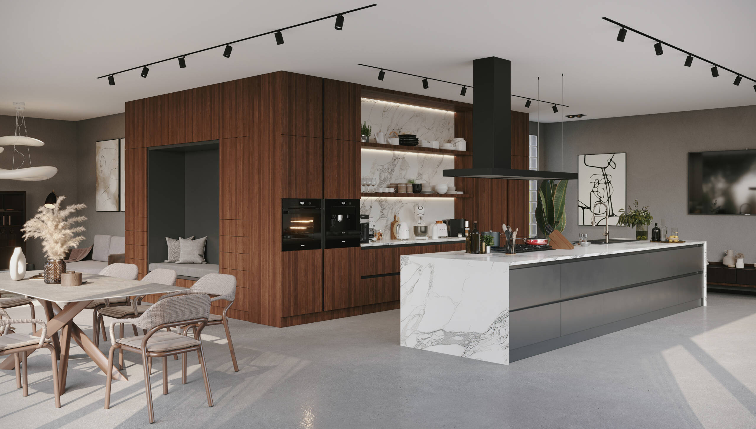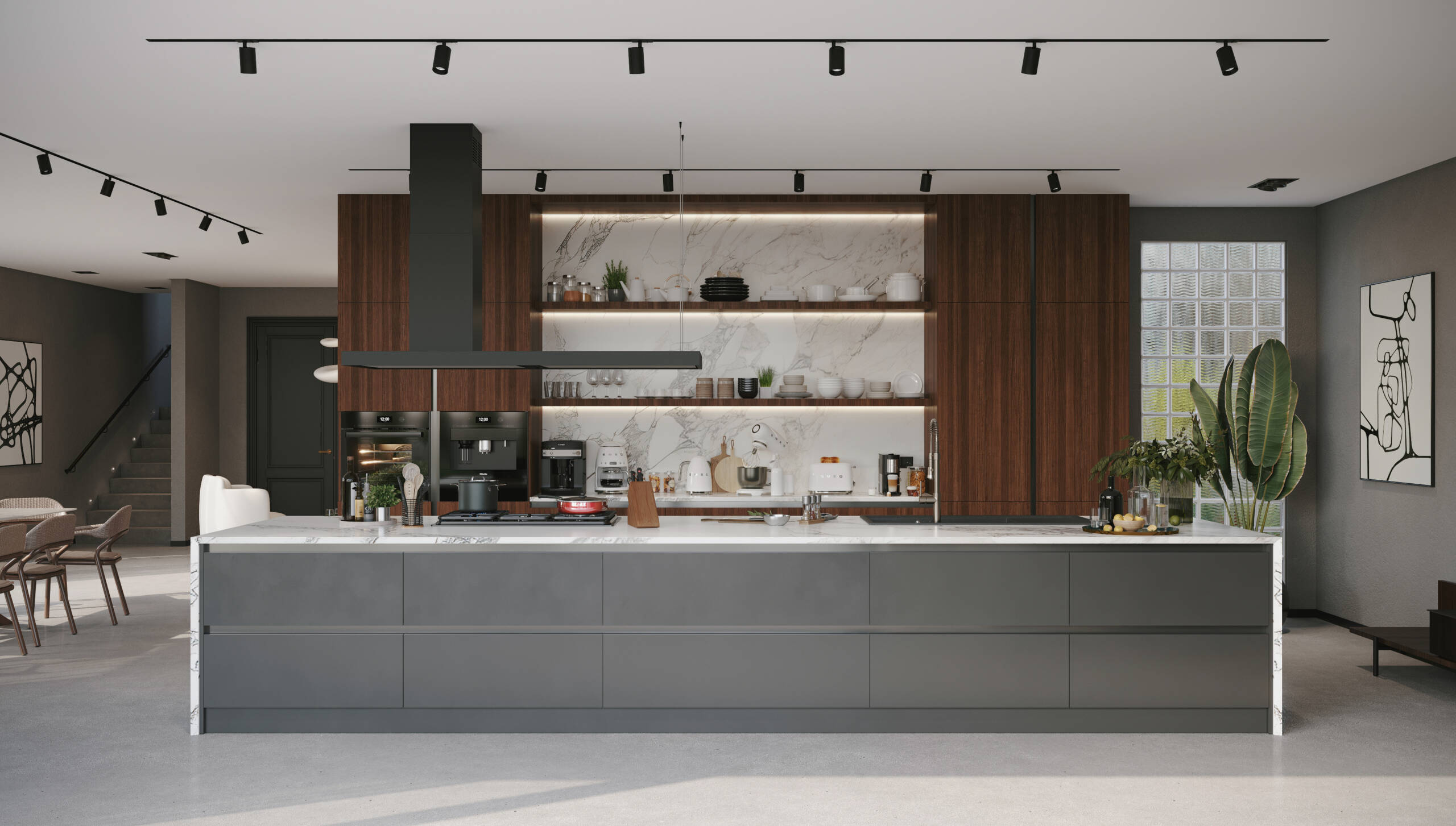 Chroma, boyutlar üzerinde yaptığı sofistike oyunla etkileyicidir. Tezgah ve dolaplar ustaca dengelenerek dinamik ve büyüleyici bir kompozisyon oluşturur. Çekmeceli raflar, alanı yaratıcı bir şekilde kullanarak bu konsepti daha da güçlendirir. Silvo’nun kendine özgü tasarım dilinde, tezgah dolapların üzerinde süzülür ve sanki havada asılıymış gibi bir izlenim yaratır. Bu, mutfak eşyaları ve kişisel aksesuarlar için mükemmel bir sahne görevi gören açık bir alan yaratır.